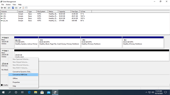 When there's a partition on this disk, you cannot convert disk type in Disk Management, because the convert option is grayed out.
