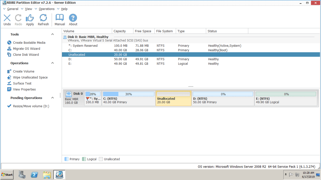 Download NIUBI Partition Editor and you'll see the main window with disk partition structure and other information on the right, available operations to selected disk or partition are listed on the left or by right clicking. In my test server, there is drive C, D, E and System Reserved partition in same Disk 0.